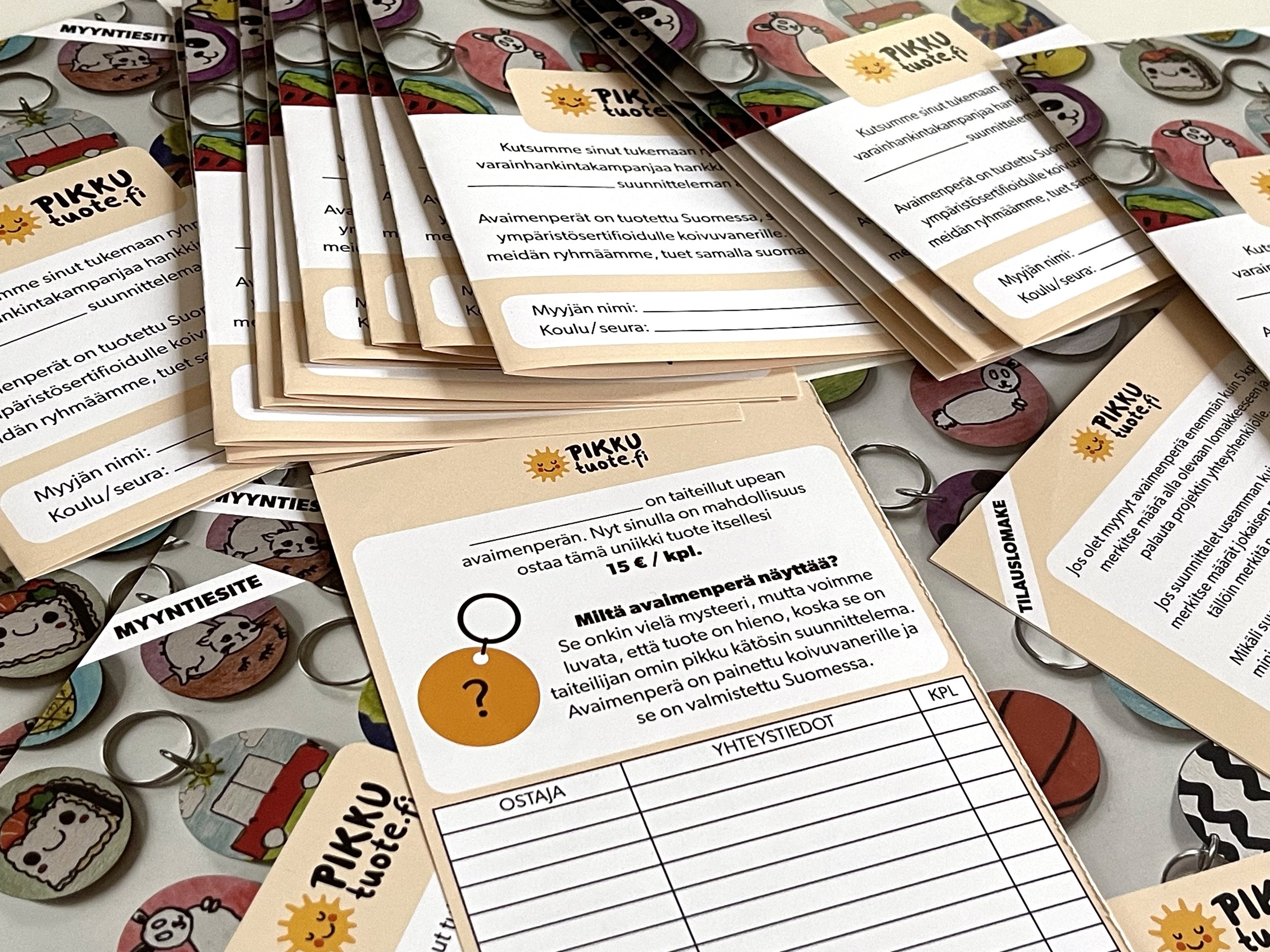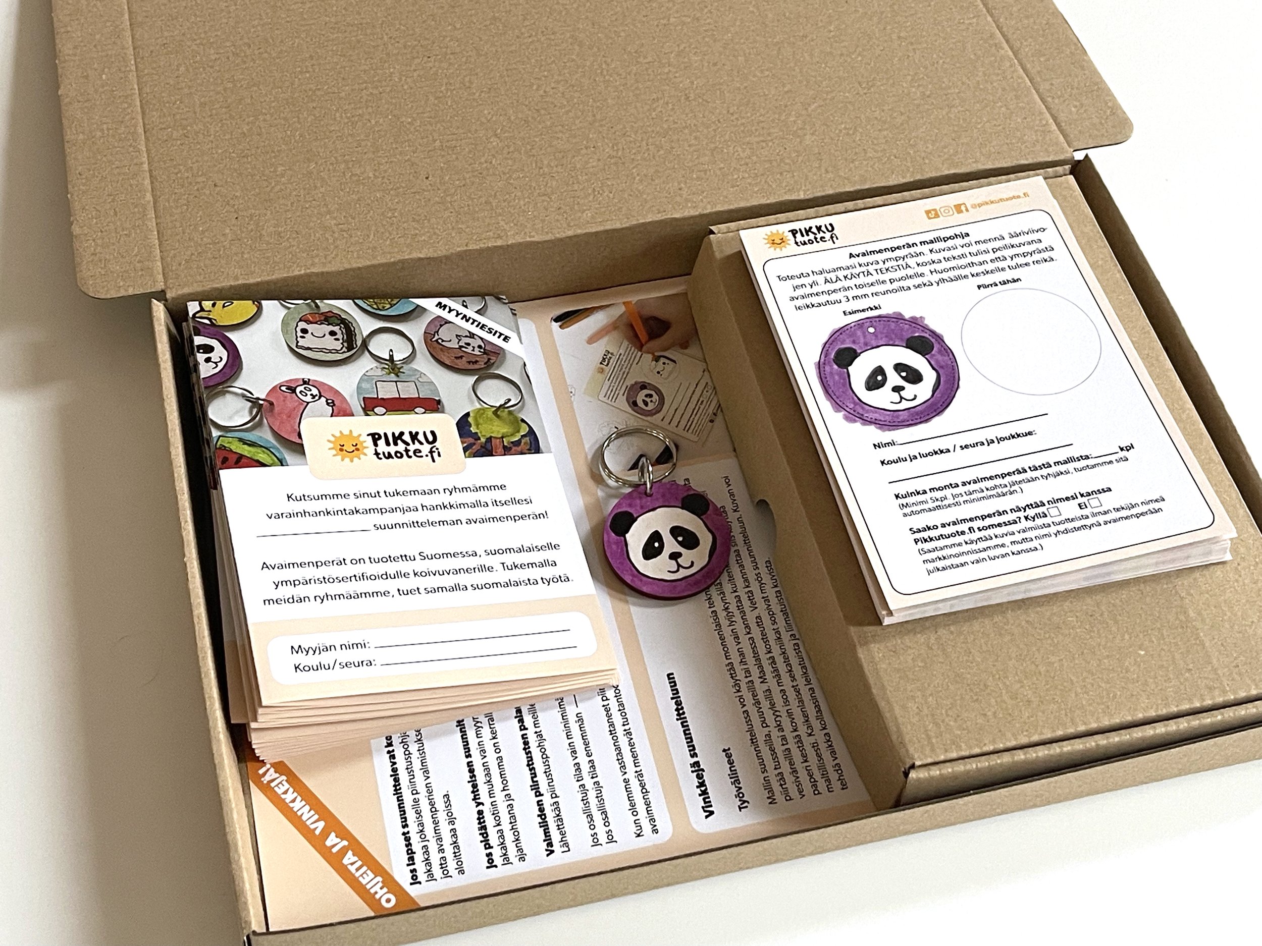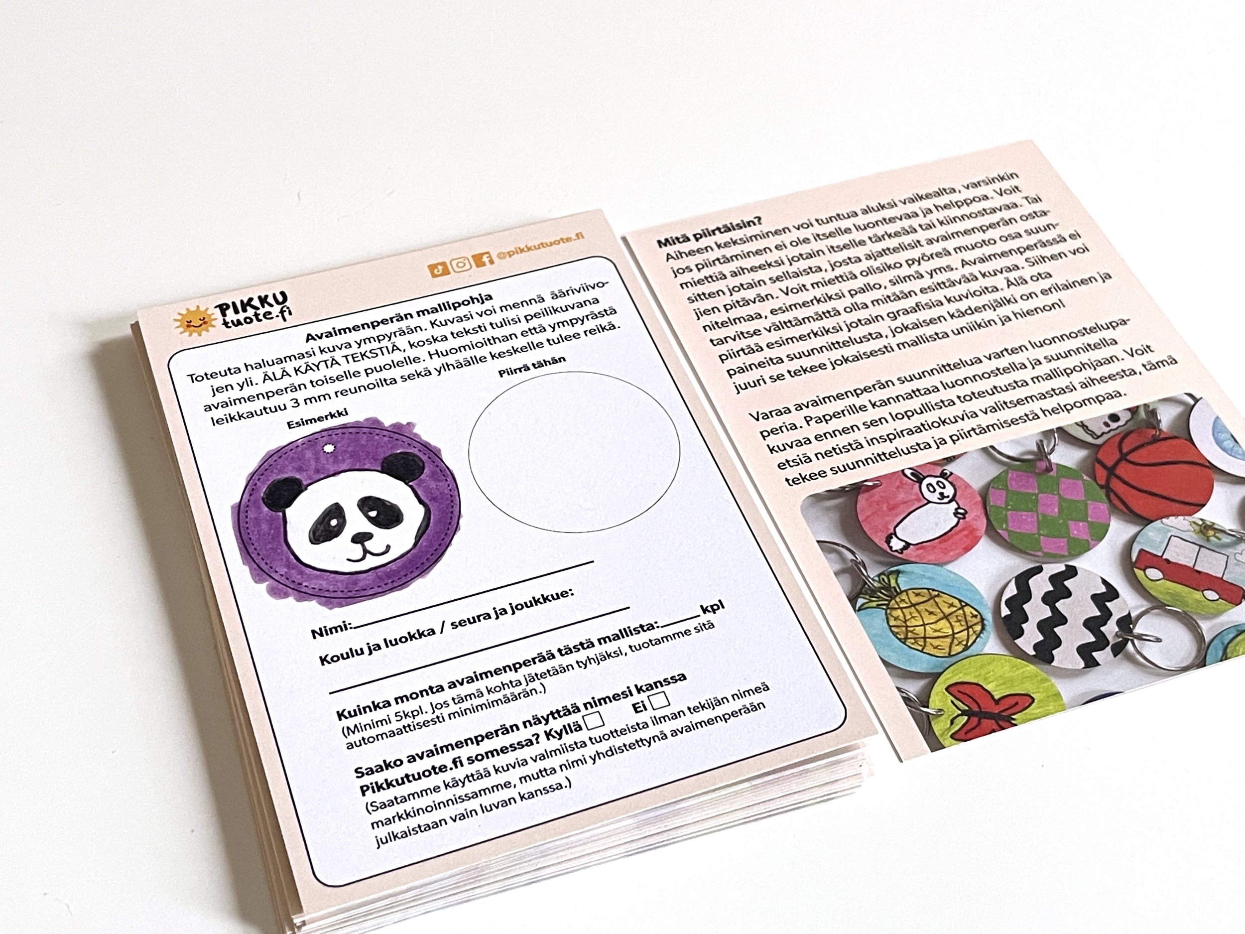 Jokaisen paketin mukana tulee esimerkkiavaimenperä jotta saatte tuntuman avaimenperien materiaalista ja koosta.