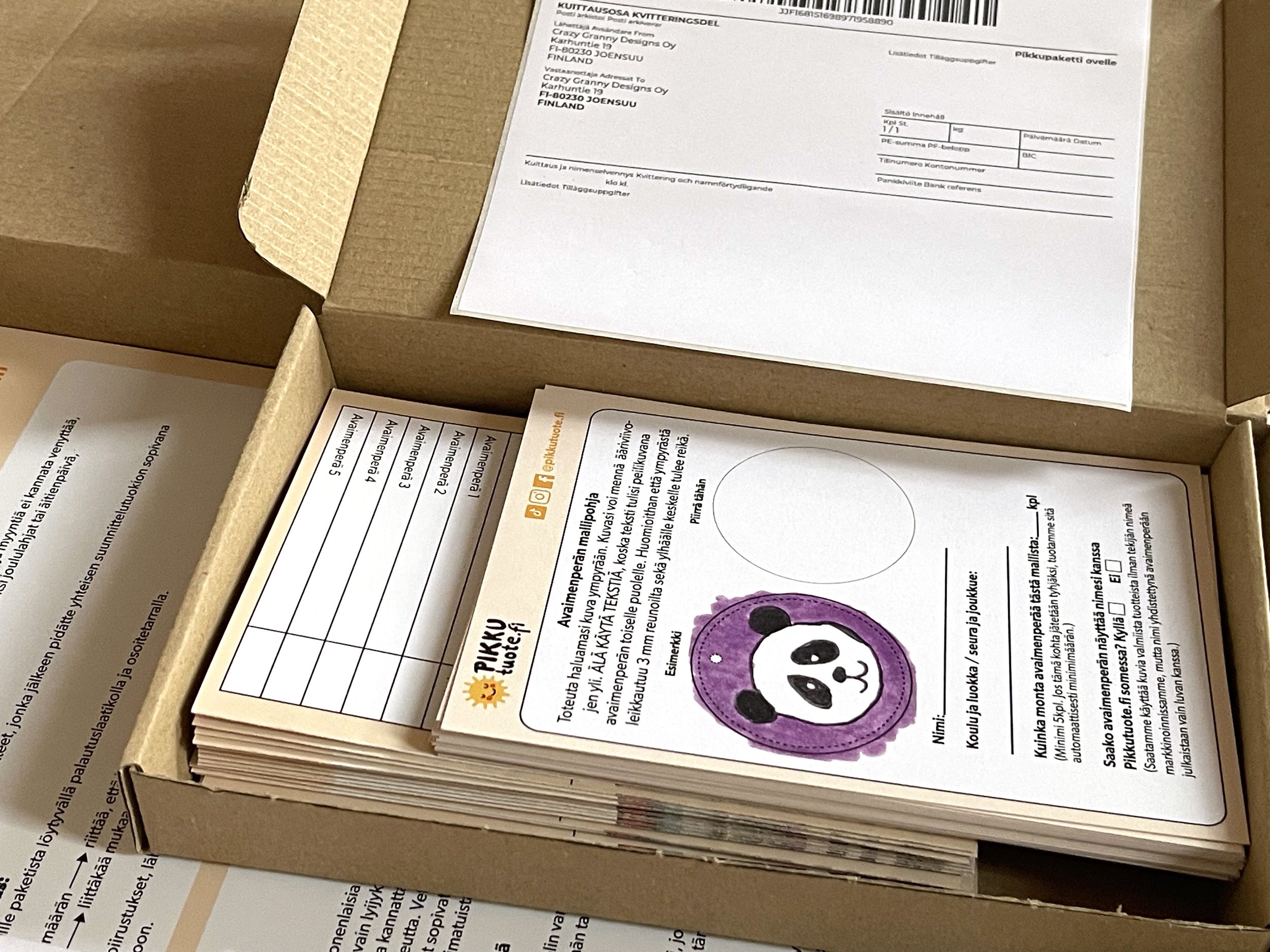 Kun projekti on valmis, laittakaa valmiit mallipohjat ja mahdolliset tilauslomakkeet palautuslaatikkoon, liimatkaa osoitelappu päälle ja viekää paketti Postin toimipisteeseen.