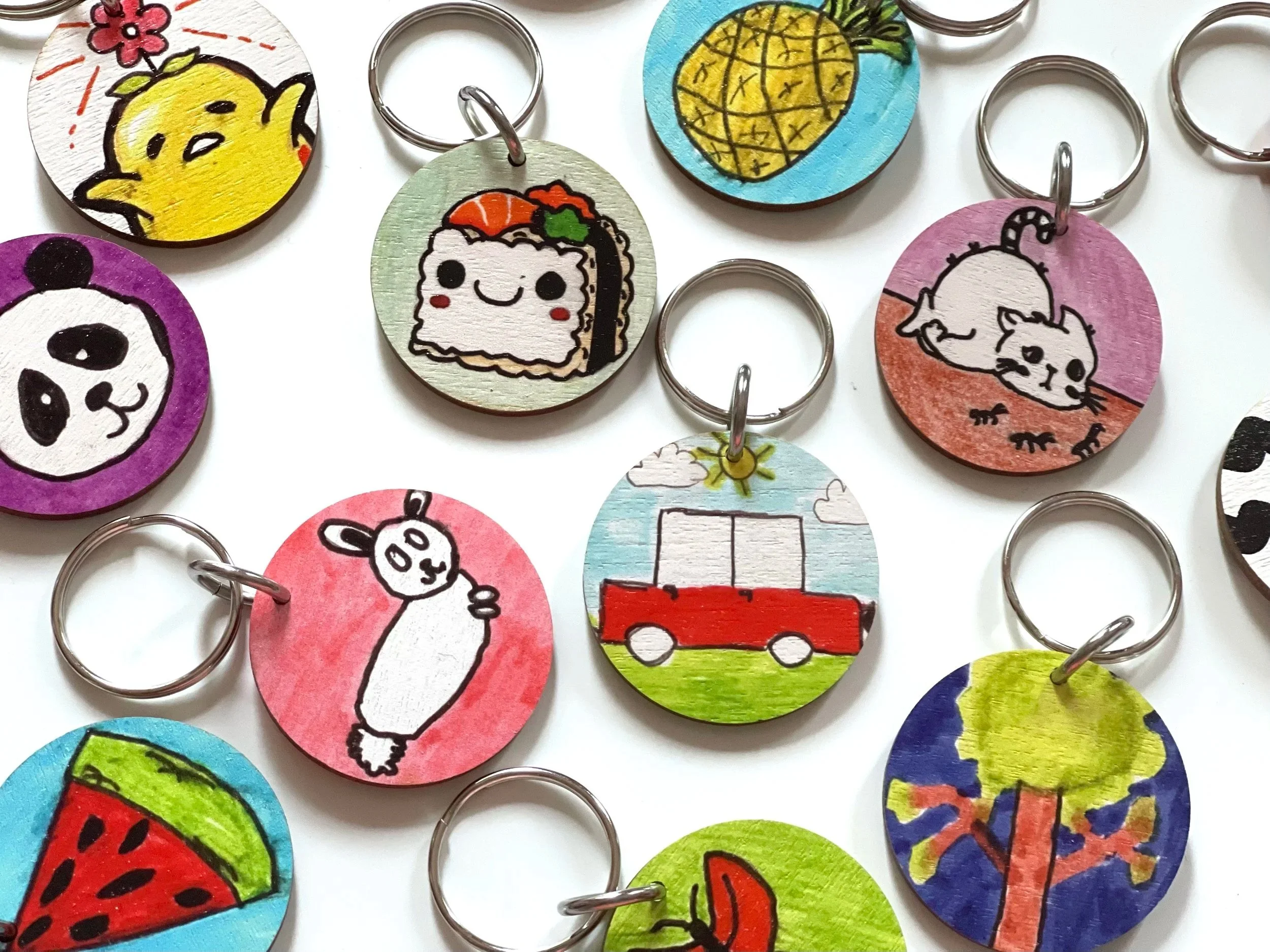 Kuvat painetaan kestävällä uv-tekniikalla. Tämä tarkoittaa sitä etteivät kuvat lähde haalistumaan esimerkiksi auringonvalon altistuksesta. Piirretty kuva toistuu avaimenperään tarkkana, mutta kannattaa huomioida, että puunsyyt kuultavat kuvan läpi. Koska avaimenperät ovat koivuvaneria, niin ne eivät kestä ihan kaikenlaista kulutusta. Niitä ei kannata esimerkiksi uittaa vedessä. Pieni kastuminen ei haittaa. Metallinen välirengas voi ajan saatossa kuluttaa vanerissa olevan reiän rikki.